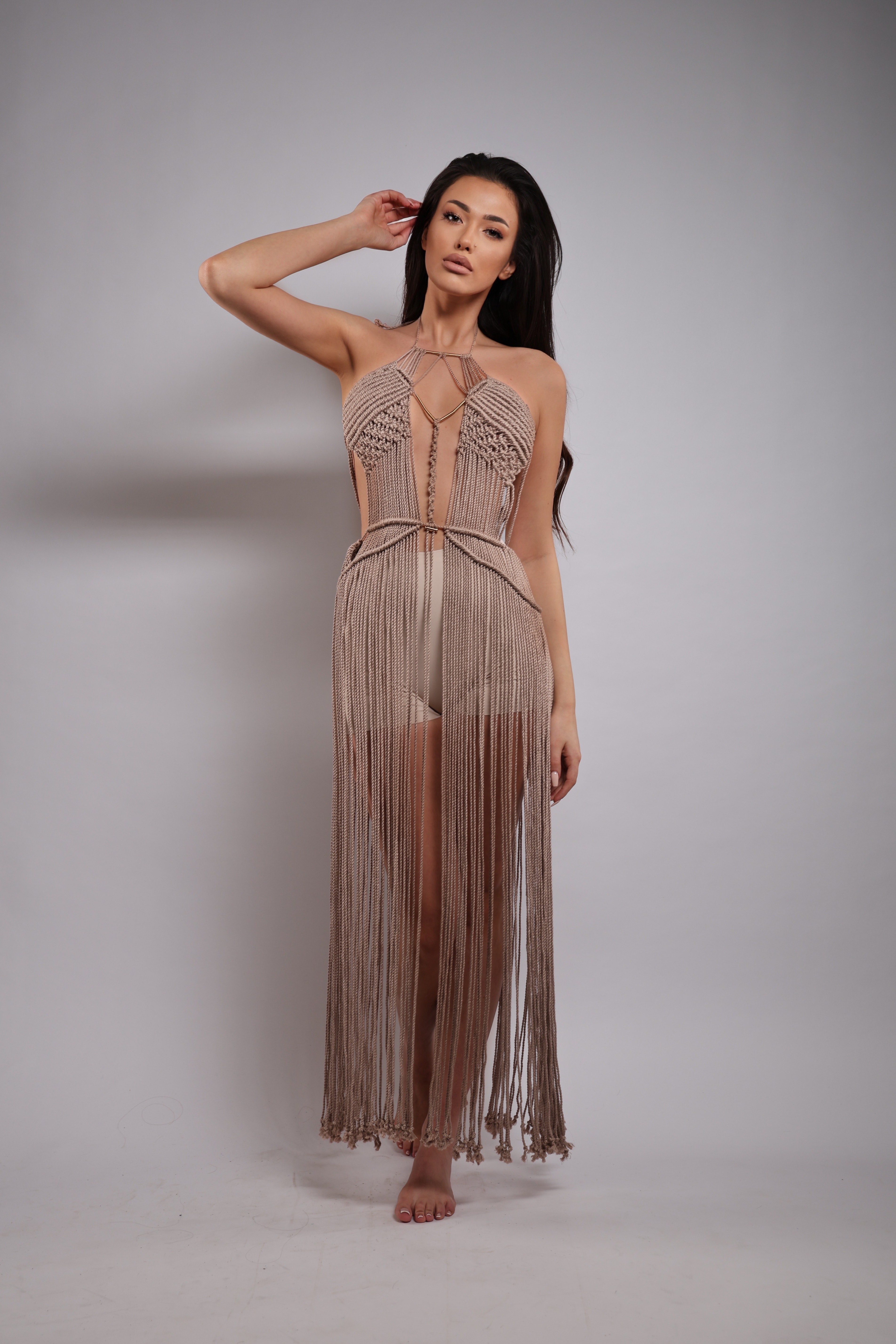 A long beige dress crafted from 100% bamboo fibers—a material celebrated for its softness and natural silk-like sheen. Designed as a versatile layering piece, the model features a precisely shaped bodice with gold-toned metallic hardware that maintains the structural integrity of the halter neckline. The airy weave allows for seamless styling over swimwear or layering with denim or mini skirts for an urban look. The skirt flows into long bamboo fringes, ensuring lightweight and elegant motion.