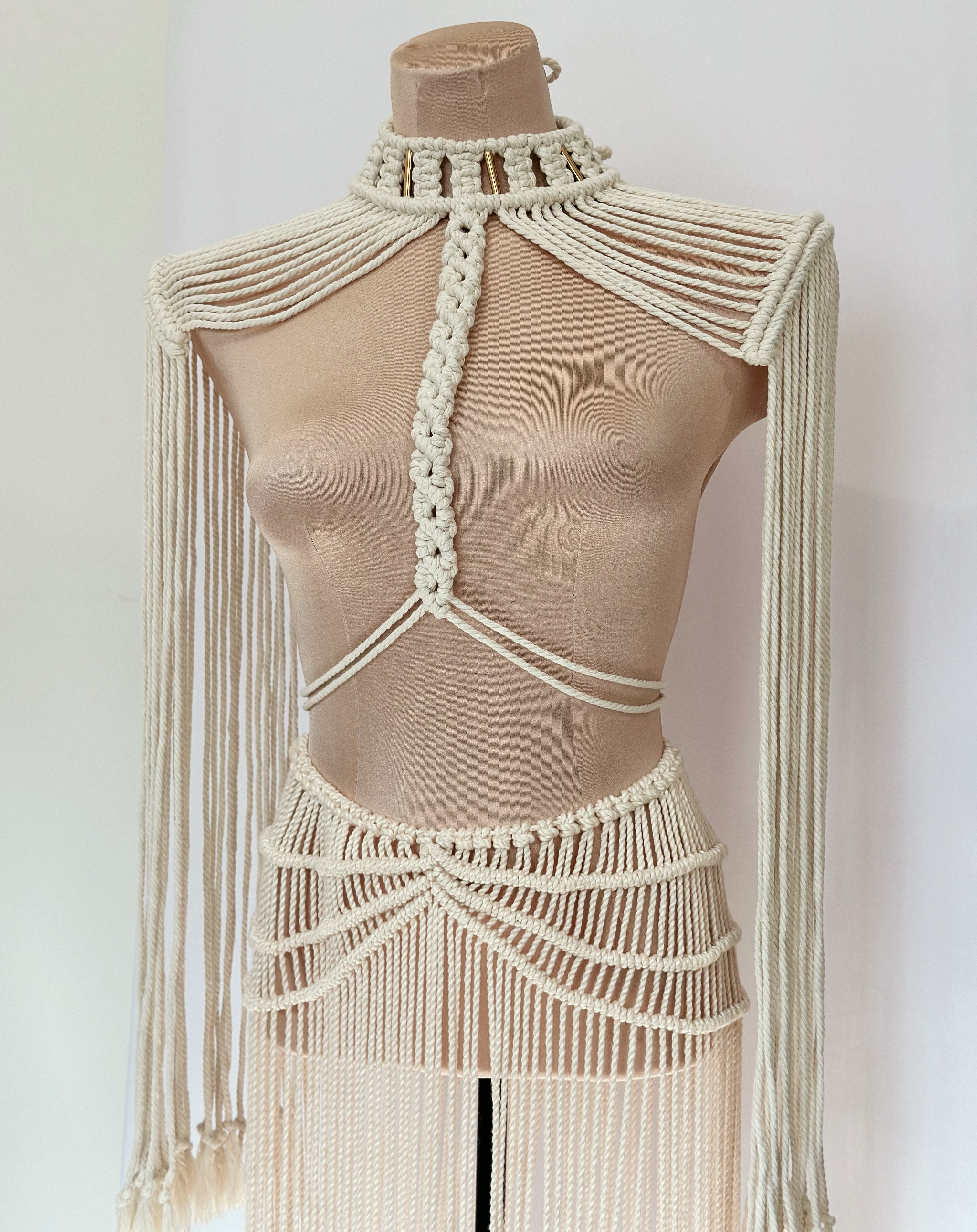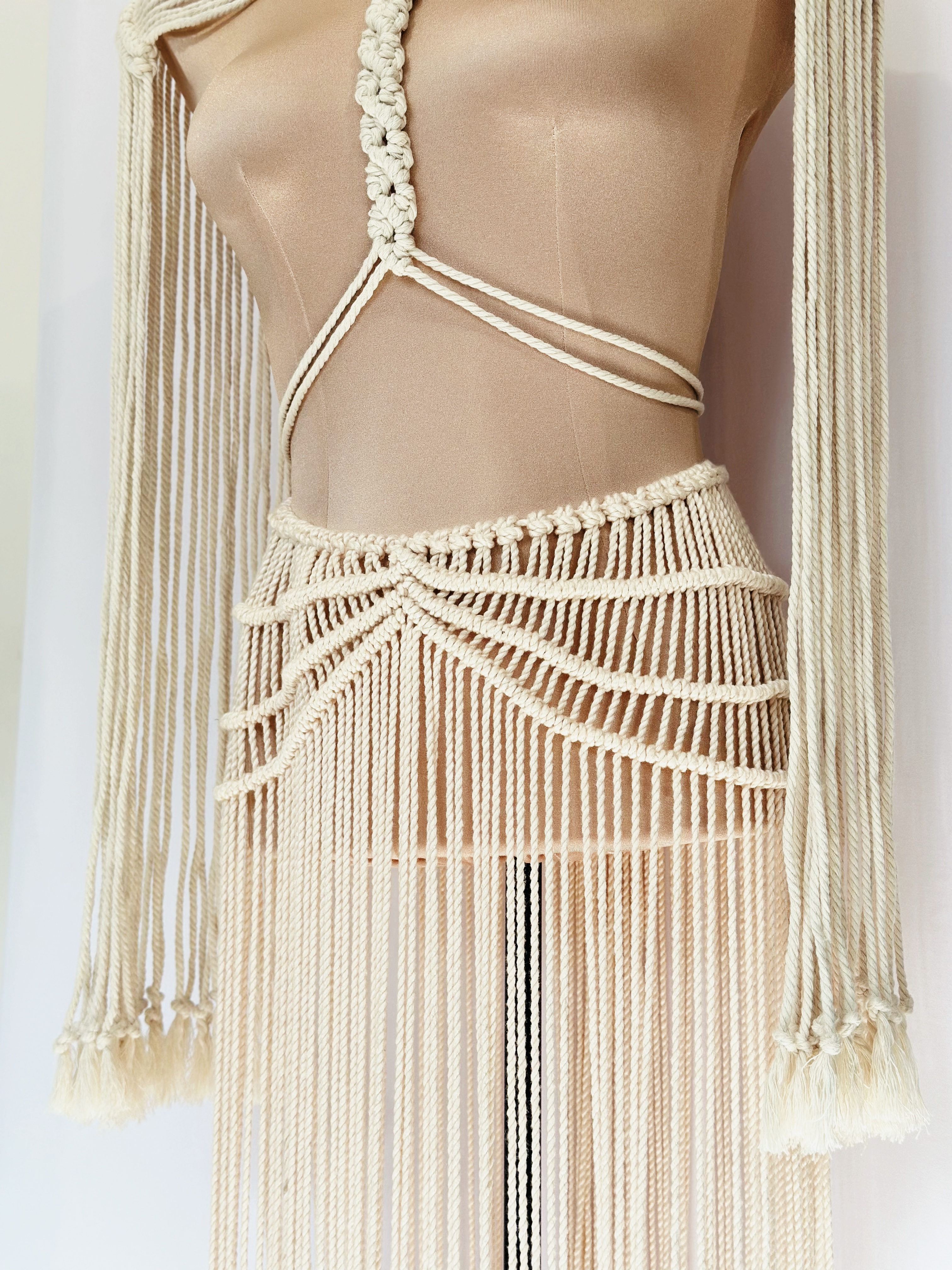Customizable Geometry: Features a versatile drawstring and tie system at both the waist and neckline, allowing for a personalized, figure-cinching silhouette that adapts to various body types. Sculptural Fluidity: Designed for a high-waisted, floor-length drape. The natural weight of the bamboo fibers ensures the fringes hang with architectural precision while reacting dynamically to every movement. Seamless Layering: Cut for a semi-transparent aesthetic, making it an ideal statement piece over minimalist swimwear, silk lingerie, or tailored tonal basics for a "Street Luxe" transition. Universal Tension: The hand-knotted structure provides a supportive yet flexible fit, accommodating natural curves without losing its complex geometric integrity.