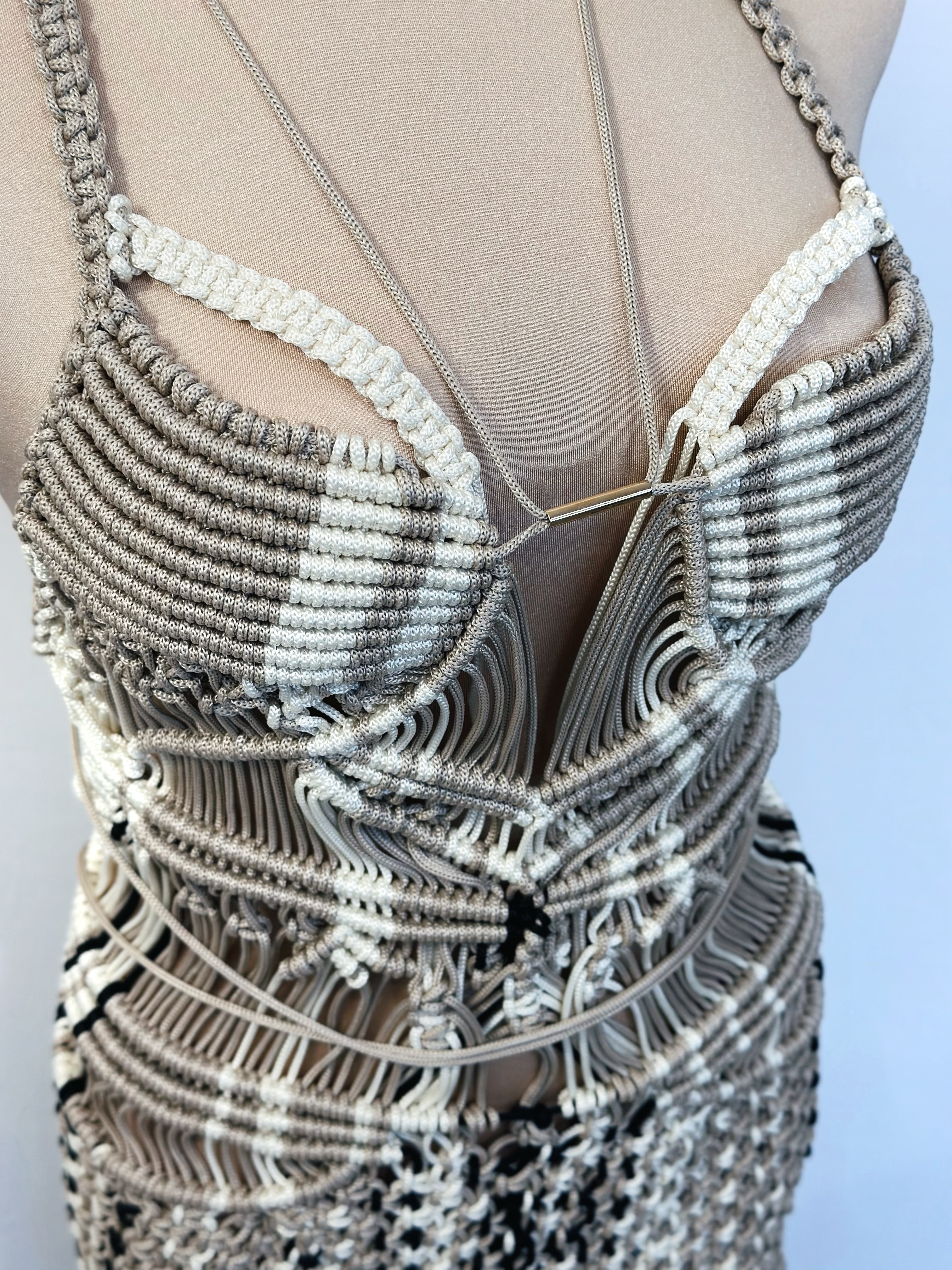 The belt is engineered as a fully standalone corset, featuring garter elements for a provocative edge. The skirt is constructed from multi-layered architectural fringes, designed to create dynamic volume while remaining remarkably lightweight.