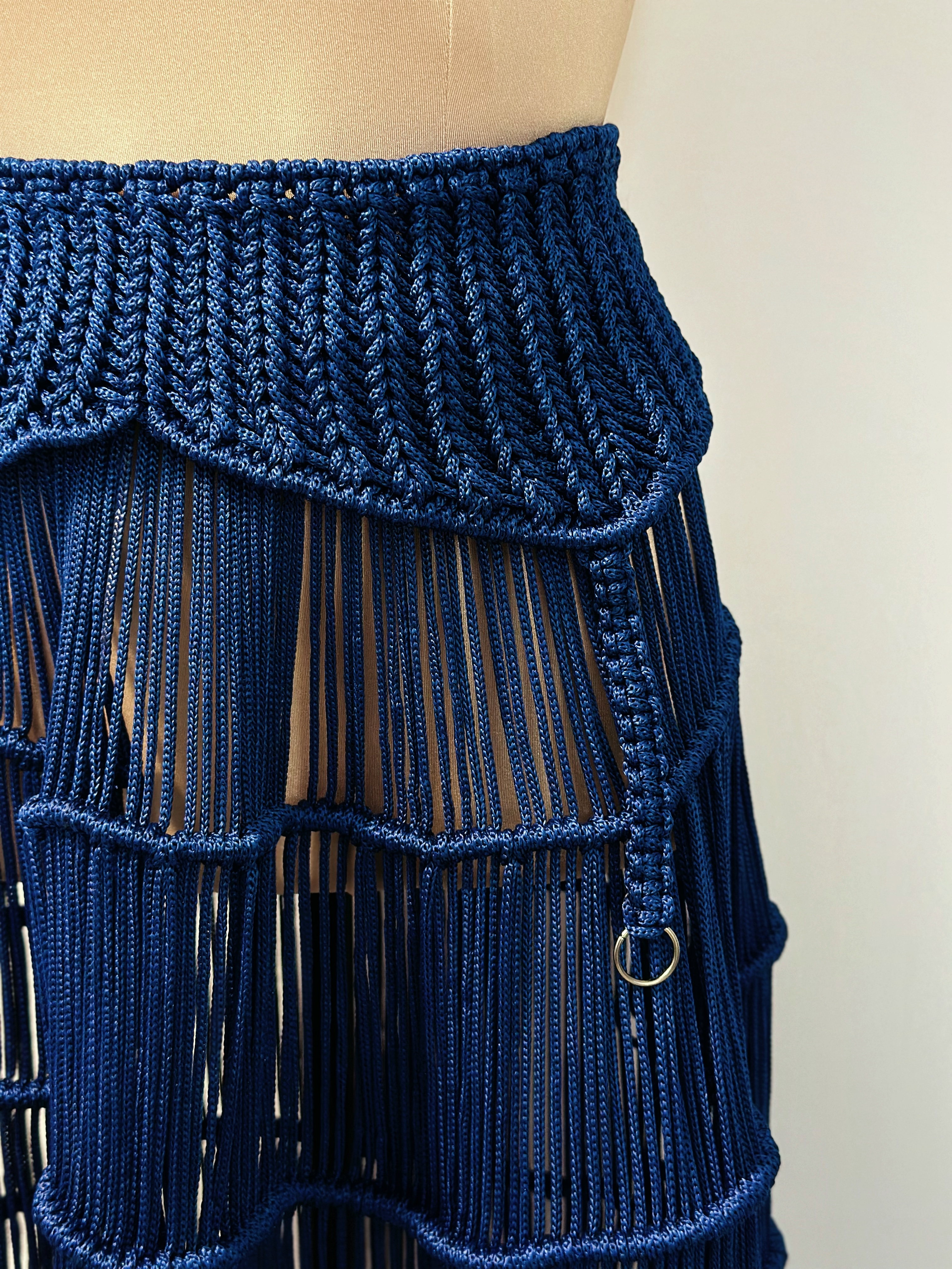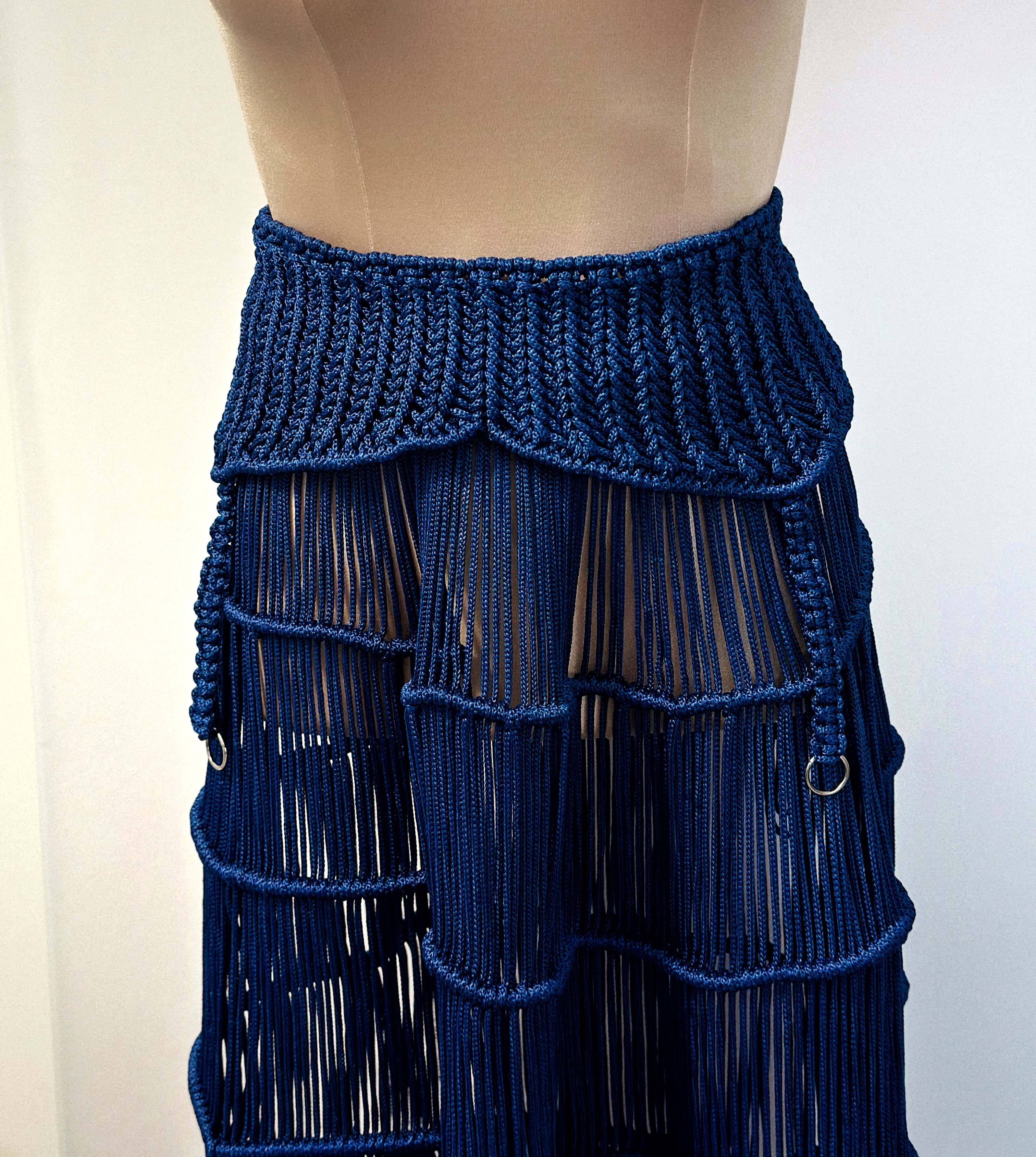 A hybrid piece in Midnight Navy, combining a corset waistband, garter-inspired suspenders, and a flared multi-tiered fringe skirt.