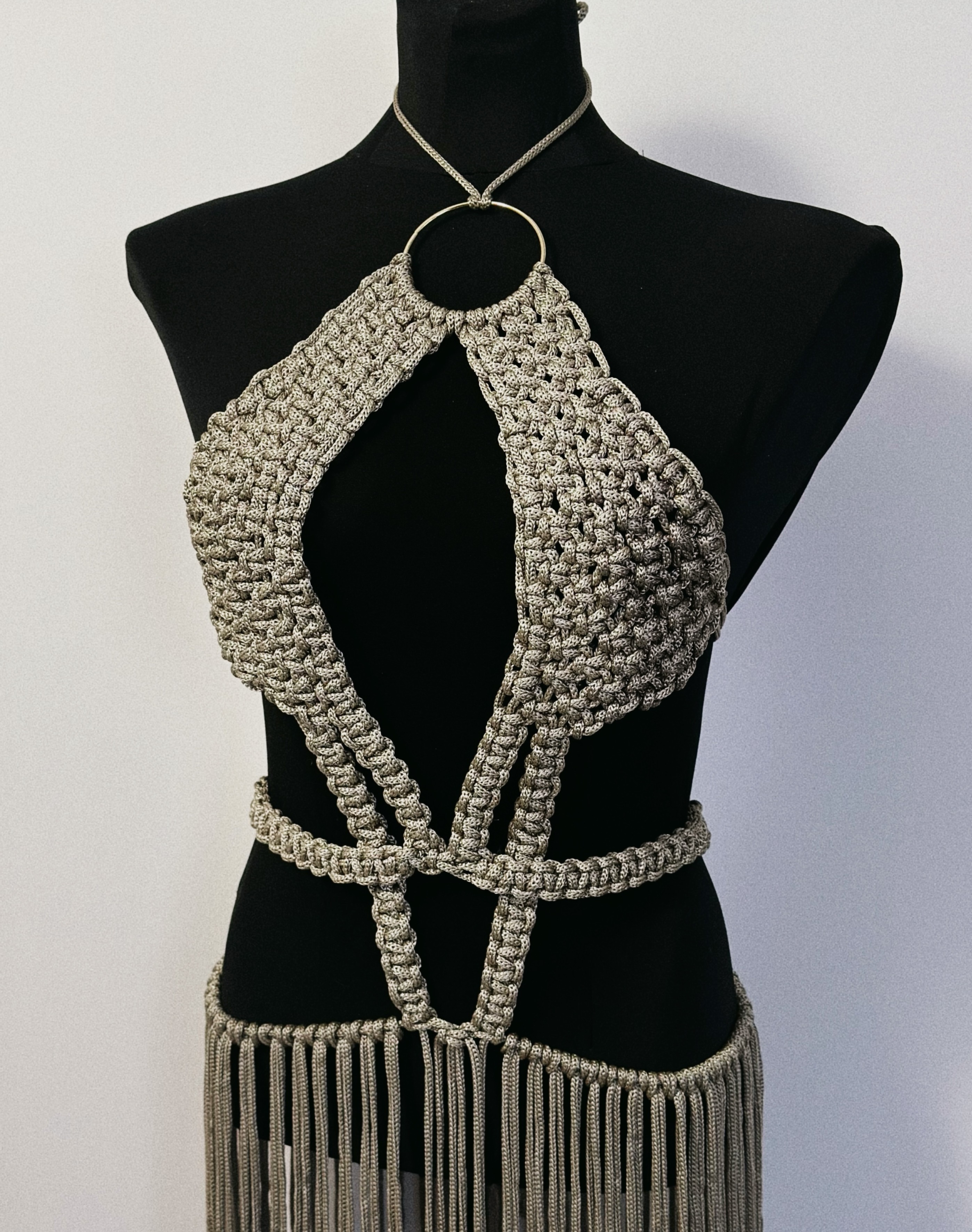 ". The construction is executed using a high-density knotting technique for maximum durability. The central bronze-toned ring and straps are reinforced to support the weight of the garment and its fringes."