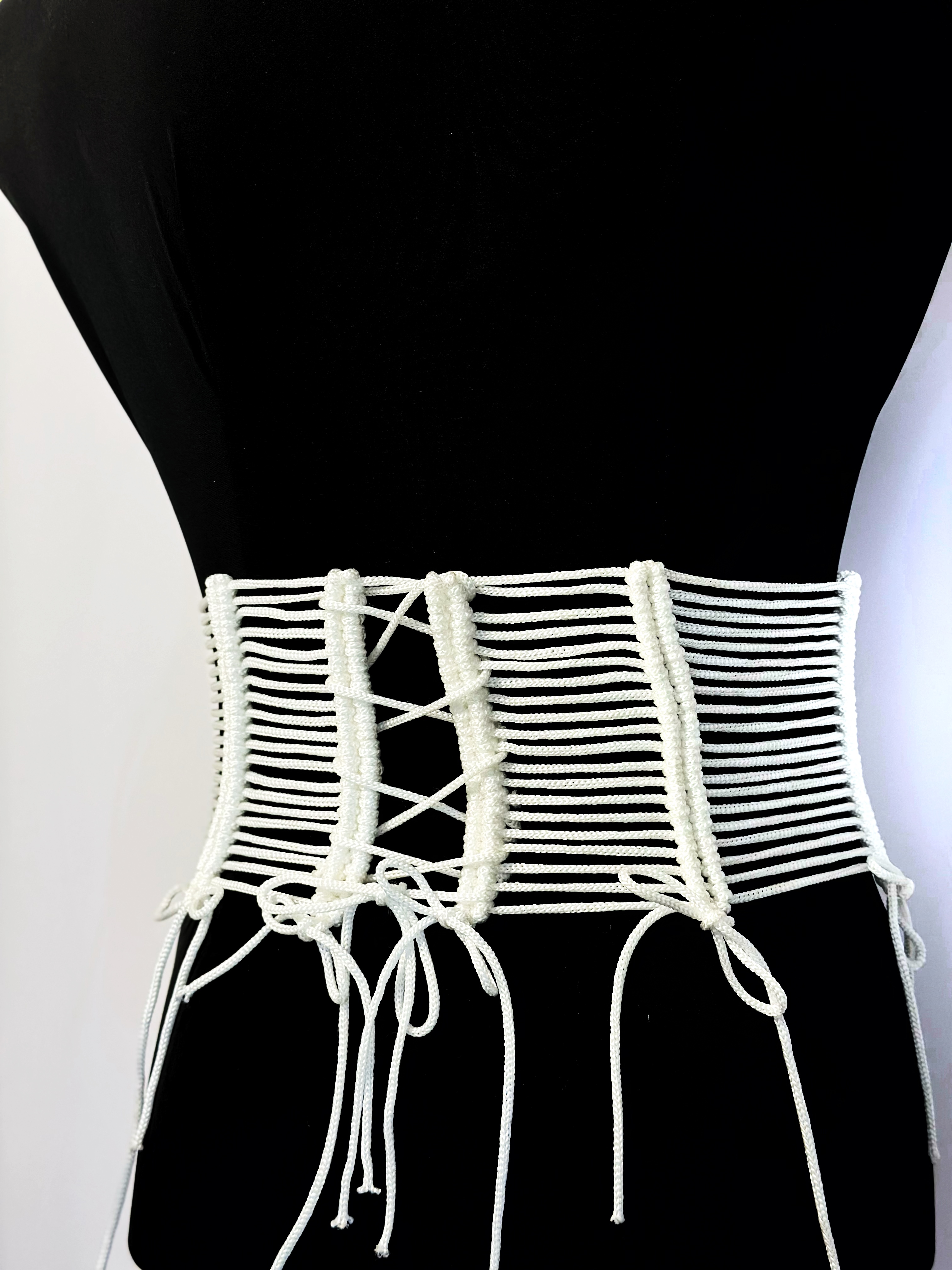 Pristine white corset belt, constructed with precision horizontal lines and vertical nautical knots. A statement piece for a defined waistline.
