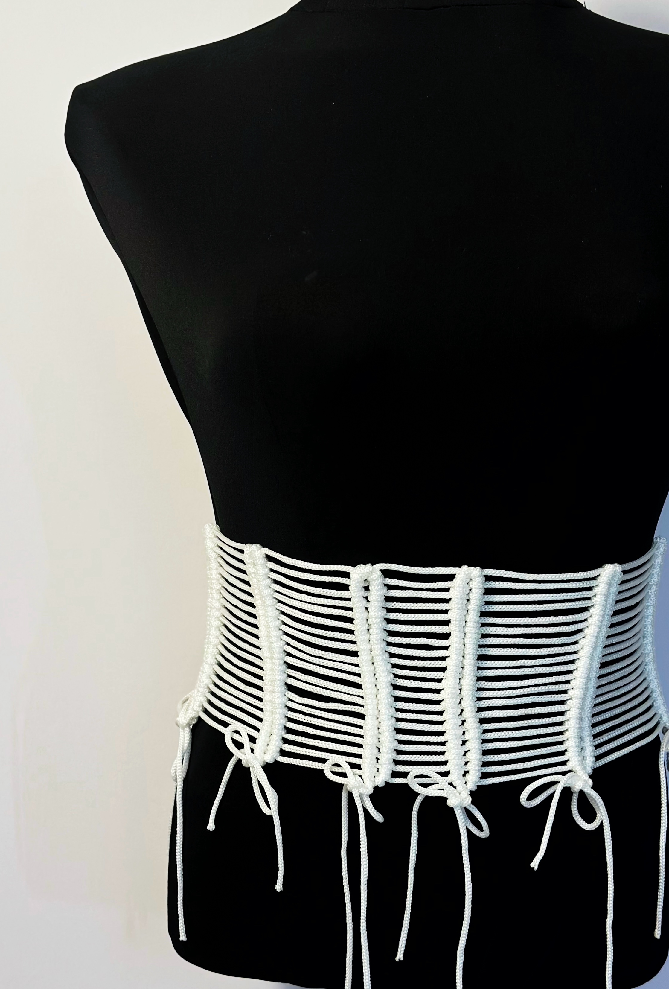 "The design is based on a controlled-tension technique, where vertical nautical knots act as structural pillars for the horizontal lines. This architecture ensures the corset maintains its rigidity and geometric precision while seamlessly adapting to the natural curves of the waist."