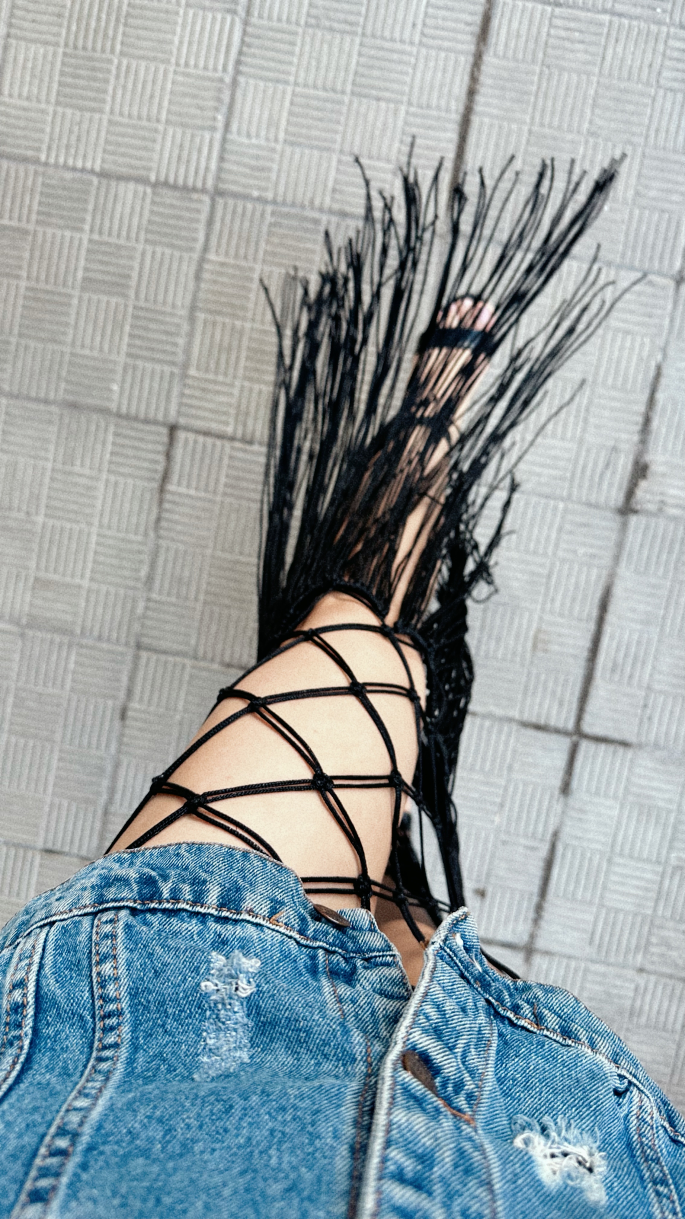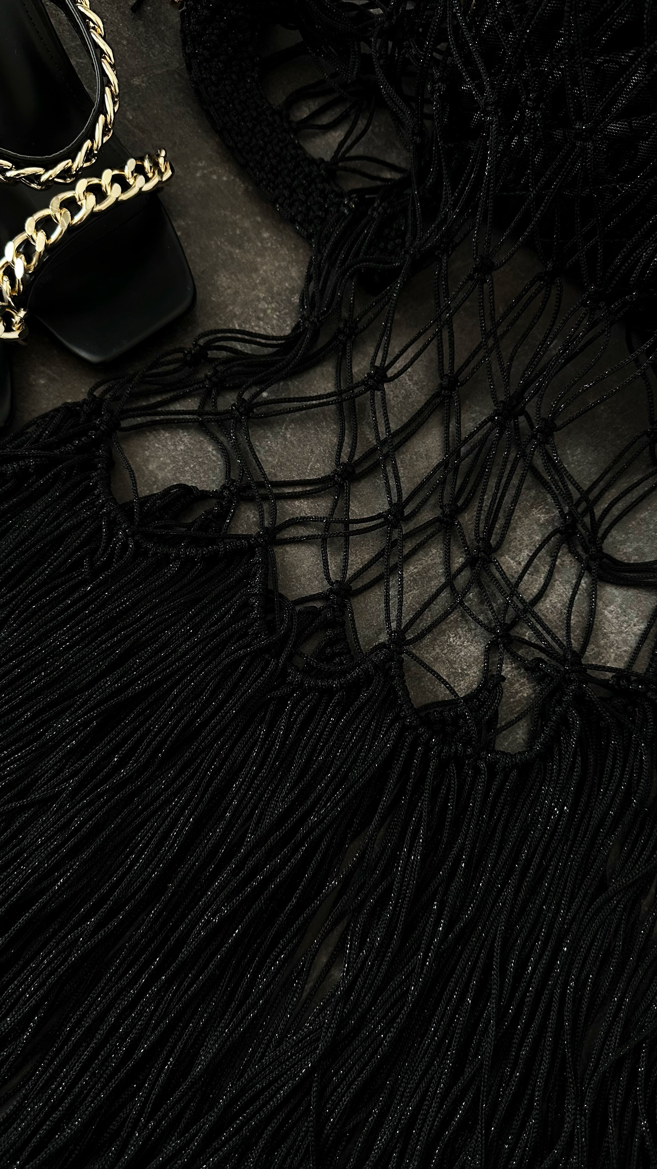 Filed under Waisted Fringe Skirt, Tyla Skirt, Black Mesh Layering, Hand-knotted Couture, Street Luxe Fashion, Open Grid Skirt, Long Black Skirt with Fringes.